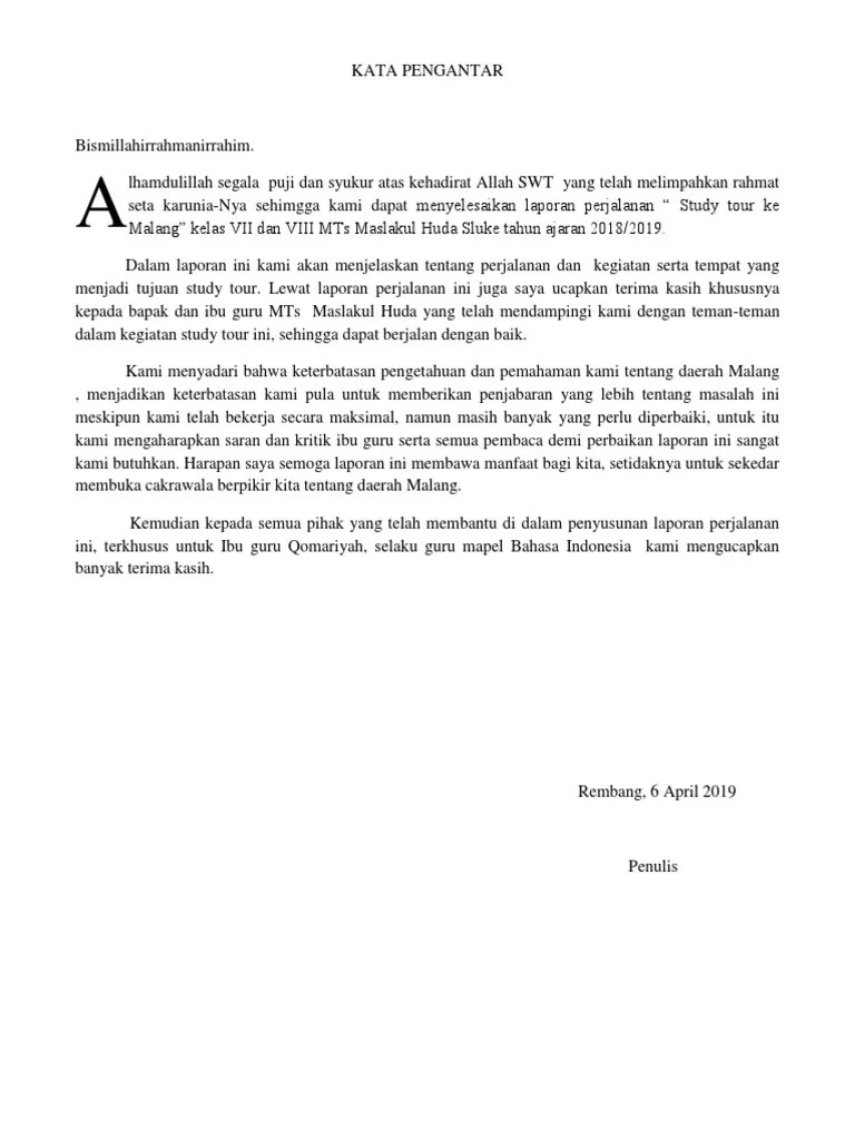 Penutup, berisi simpulan dan saran tentang perjalanan yang . Ulasan mengenai beberapa contoh kata pengantar laporan kegiatan, pkl, penelitian, praktikum, study tour, observasi, kunjungan industri, dll. Dan setiap karya ilmiah itu, pasti memiliki contoh kata pengantar sebelum memasuki. Contoh kata pengantar laporan study tour ke bali. Guru bidang study yang mengajar mata pelajaran biologi di kelas saya.